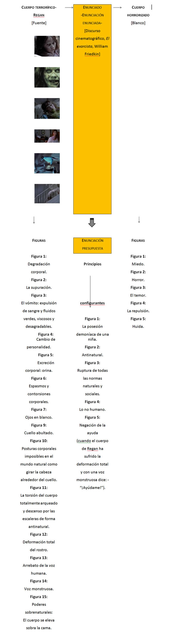 La fealdad extrema, lo grotesco y lo siniestro figuran a un cuerpo terrorífico alejado de todo lo conocido. Por tanto, se acentúa el miedo, el horror y la angustia a tal grado que el espectador es colocado en los márgenes de todo lo conocido. El cuerpo horrendo, aunado a lo siniestro y lo sobrenatural, lleva al espectador a imaginar y sentir lo que no se ha sentido. Además, lo siniestro coloca al cuerpo horrísono en la figuración de lo no visto y lo no deseable, tal como ocurre con El exorcista (1975) donde William Friedkin pone énfasis en los imaginarios inaceptables. Las figuras de las de la degradación corporal del texto de Friedkin se exponen con la siguiente sintaxis discursiva figurativa: