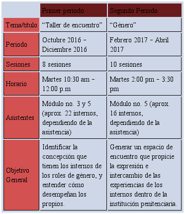 El taller se realizó con el objetivo general de crear un espacio para la expresión e intercambio de experiencias dentro y fuera del espacio penitenciario. Se definieron como objetivos específicos: identificar la manera en que los internos perciben y resuelven los diferentes conflictos planteados en las actividades; las figuras de autoridad y los discursos que éstas promueven; así como conocer las diferentes perspectivas que tienen los internos acerca de su estar y devenir penal. Posteriormente, a partir del desarrollo de los talleres y mediante las interacciones con los internos, se definió el objetivo de investigación, siendo este: conocer la manera en que los internos significan los discursos psicológicos (Ver Tabla 1)