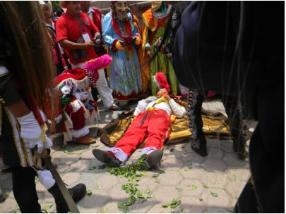 Aquí la imagen de Santiago sufre una transformación en una especie de inversión del símbolo, es decir que parte de la cosmovisión española de la colonia, como el guerrero que combate con las huestes españolas, a la de un santo que es ejecutado por el bando que representa el bando indígena, y que en su muerte se convierte en un generador de bienes para la comunidad que le mata, a través de la repartición de los frutos que simulan las partes de su cuerpo y además de los milagros que constantemente concede.