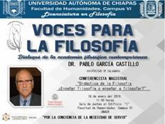 El proyecto de investigación Voces para la filosofía. Diálogos de la academia filosófica contemporánea, registrado ante la Dirección General de Investigación y Posgrado de la Universidad Autónoma de Chiapas, con recursos propios, busca integrar material para el análisis del estado del arte de la filosofía en el contexto externo al estado de Chiapas. Para ello se llevó a cabo una convocatoria a cada una de las Instituciones de Educación Superior en México donde se oferta la Licenciatura en Filosofía, extendiendo dicha invitación a la Universidad de Salamanca y la Universidad de León, ambas instituciones españolas; de modo que, a través de la impartición de una serie de Conferencias Magistrales con tópicos que permitieran incorporar la fundamentación teórica de manera reflexiva al conjunto de conocimientos de especialistas en un sentido amplio.