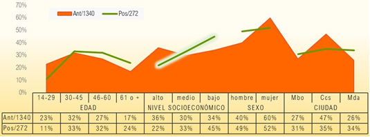 En el diagrama 3, la línea de posposición se eleva fuera del área de anteposición en las variantes cuyo residuo es positivo. El nivel socioeconómico es, justamente, el único factor que ostenta un patrón inverso de distribución de las proporciones. Asimismo, aunque la ciudad dibuja una curva similar en ambos usos, la posposición se eleva en merideños y maracuchos, en contraste con los hablantes capitalinos.