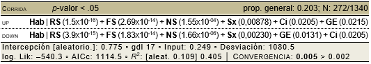 Utilicé un análisis de regresión logística binomial (up&down) para establecer la contribución conjunta de las variables a la posposición. Procesé los datos con Rbrul (Johnson, 2009), un programa estadístico que puede aplicar tanto el modelo tradicional de efectos fijos como uno lineal generalizado de efectos mixtos.