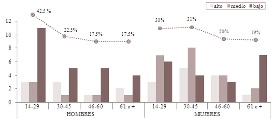 En la tabla 11 se observa que la mitad de los casos se registran en el nivel socioeconómico bajo (51%); asimismo, los hablantes entre 14 y 45 años son quienes suman los porcentajes de uso más altos (63%). Las mujeres emplean un poco más el posesivo ponderativo en la muestra, la mayoría de ellas son caraqueñas de clase baja; no obstante, las merideñas de las clases media y alta, aunque menos, también contribuyen al empleo. Los hombres, en cambio, concentran la mayor cantidad de casos en el nivel bajo; siendo los andinos de esta clase social quienes aportan un número sustancial de ponderativos. La correlación entre la edad y nivel socioeconómico se aprecia en el diagrama 5: