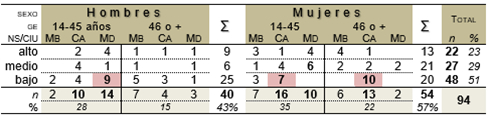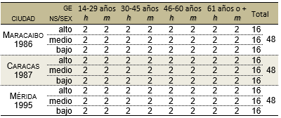 La muestra está constituida por 144 grabaciones del Corpus dialectal para el estudio sociolingüístico del español hablado en Venezuela a finales del siglo XX (Cf. Guirado, 2021). El CORDIA-VEN-sXX es un subcorpus, producto de la reingeniería de tres corpus del proyecto GREHV (Cf. Bentivoglio, 1996), creado con el propósito de hacer análisis en una microdiacronía del siglo XX.[8] Las entrevistas están distribuidas equitativamente en tres dialectos: Maracaibo, Caracas y Mérida; cuatro grupos etarios: 14 a 29 años, 30 a 45, 46 a 60 y de 61 o más años; tres niveles socioeconómicos: alto, medio y bajo; y sexo: hombres y mujeres. En la tabla 1 se puede observar la distribución: