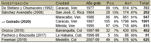 A continuación, se desglosan los casos analizados por dialecto y se comparan con las frecuencias registradas en otras cuatro ciudades americanas (San José de Costa Rica: Sánchez, 2008; Barranquilla: Orozco, 2010; La Habana: Pacheco y Bouzouita, 2017; Medellín: Freeman, 2019):