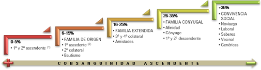 Por una parte, el uso del posesivo con entidades más humanas [+HUM] permiten indicar favoritismo por una figura pública (cantantes); relaciones consanguíneas genéricas (antepasados, familiares), ascendentes (mamá, abuelo), colaterales de 2º, 3º y 4º grado (hermanos, prima, tía, sobrino) y descendentes (hijos, nieta); parentesco por afinidad directa (esposo, mujer) e indirecta (suegra, cuñado); así como diversas relaciones sociales (bautismo, amistad, noviazgo, laboral, vecindad y transmisión de saberes).