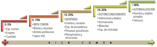 El hablante está sujeto, consciente o inconscientemente, a la idea del bien común, del bienestar social orientado hacia el progreso de las personas, con lo cual, –y bajo la expectativa de una entrevista– no es de extrañar que trate de expresarse en términos de desarrollo personal y enfoque su expresividad en aquellas entidades más cercanas a la utilidad individual, marcando especialmente aquellas que expresan propósitos particulares (el anhelo mío) y autorrealización (el carro mío).