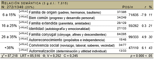El análisis indica una asociación significativa entre la posición del posesivo y la variable semántica (. < .05). Los resultados coinciden con los ya descritos: la tendencia a la posposición parece aumentar con los sustantivos que expresan convivencia social y autorrealización (.=6.1) y con entidades que hacen referencia a las relaciones derivadas del núcleo conyugal y al autorreconocimiento del hablante (.=4.9).