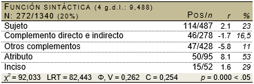 El atributo registra la tendencia más alta de posposición (53%) y los datos indican una notable asociación de dependencia del posesivo pospuesto cuando modifica grupos nominales en esta función (.=8.1). Asimismo, se observa que la función de sujeto (.=2.1) y los incisos y topicalizaciones (.=1.6) también contribuyen al empleo: