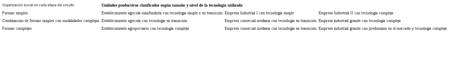 Los agentes económicos y sociales de este circuito productivo ideal se presentan clasificados acorde con el tamaño de la actividad productiva y el nivel de la tecnología empleada, simple, en transición y/o compleja. Esta comprende tanto la incorporación de avances técnicos en la fase productiva de la empresa o unidad de producción como también en el nivel de la gestión y organización.