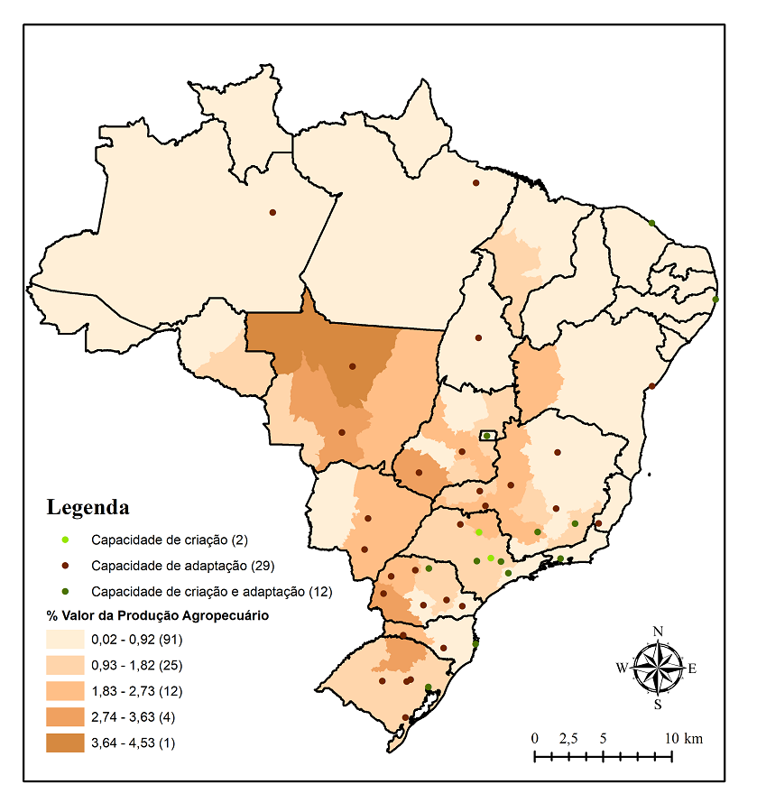 No tocante à capacidade adaptativa, existem continuidades maiores entre produção agrícola e conhecimento. Isso se explica por se tratar de serviços com menor grau de complexidade, o que faz sua dispersão territorial ser mais simples; e pela maior necessidade da produção de conhecimento decorrente de uma proximidade com o campo para facilitar o contato junto aos produtores, além do reconhecimento das exigências particulares das condições edafoclimáticas.