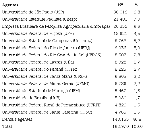 Utilizando a publicação de artigos científicos como indicador para a produção de conhecimento na agricultura, a Tabela 1 demonstra que as universidades e centros públicos de pesquisa continuam sendo agentes centrais no SIA.