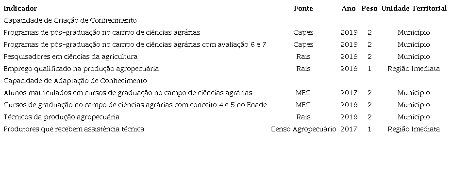 Para identificar os municípios com maior capacidade de adaptação de conhecimento na agricultura, foram empregados indicadores referentes aos cursos de graduação na área de ciências agrárias, aos serviços de assistência técnica e aos produtores que fazem uso da orientação técnica.