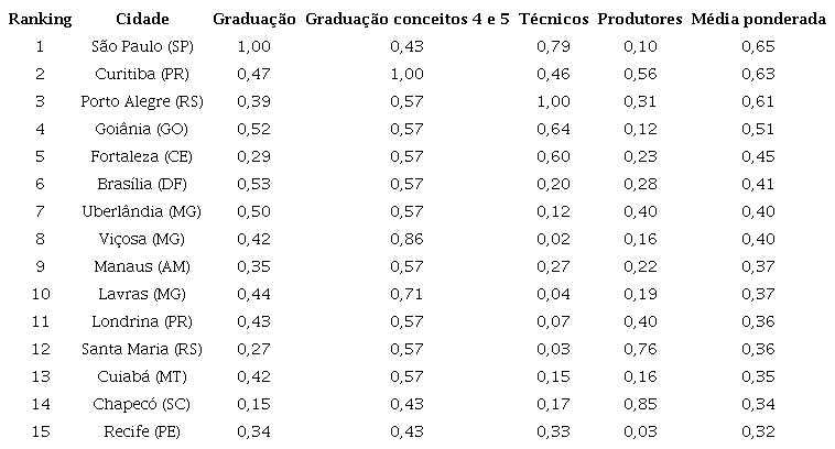 A presença de São Paulo no primeiro lugar não chega a ser surpresa. Por um lado, essa posição se explica pelo amplo número de estudantes matriculados em cursos de graduação nas áreas de ciências agrárias; por outro, pelo dinamismo da economia de serviços na capital paulista, que gera empregos para técnicos agrícolas. O posicionamento de Curitiba em segundo se deve ao sistema de ensino, uma vez que a Universidade Federal do Paraná (UFPR) e a Pontifícia Universidade Católica do Paraná (PUC-PR) obtiveram conceitos 4 ou 5 no Enade, nos cursos nas áreas de ciências agrárias. Porto Alegre, que aparece em terceiro, é sede da Emater/RS e de importantes cooperativas, o que resulta no aumento no número de técnicos agrícolas.
