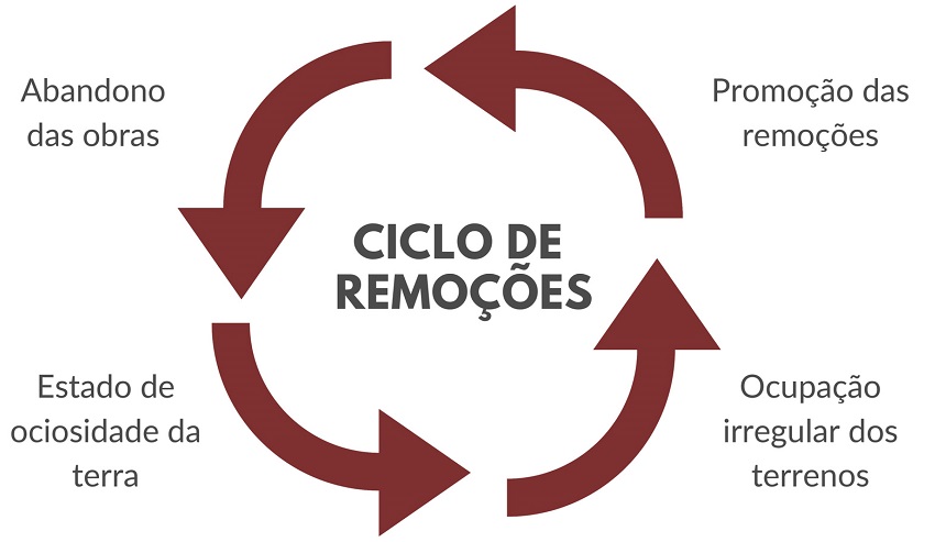 Pelo que foi retratado, a conjuntura segue um percurso que inclui as seguintes fases: a promoção de remoções (inicialmente para viabilizar as obras de macrodrenagem), a paralisação das obras, o estabelecimento do estado de ociosidade da terra e a ocupação irregular dos terrenos ociosos por uma população vulnerável do ponto de vista socioeconômico. Depois disso, são realizadas novas remoções da ocupação irregular, e a situação se repete em um processo cíclico, que chamamos aqui de ciclo de remoções (Figura 1). Os fatores envolvidos na criação do ciclo de remoções explorados ao longo do artigo são associados a diferentes agentes da esfera pública ou privada, envolvendo desde órgãos públicos até o crime organizado.