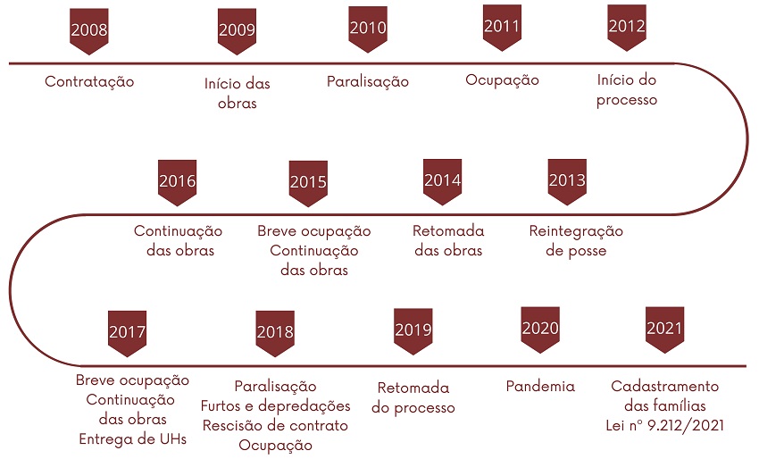 Após a área ter sido desocupada, as obras foram retomadas, mas novamente passaram por diversos problemas ao longo do tempo, como dificuldades para emitir o licenciamento ambiental (gerando paralisação das obras) e eventos de roubos e depredações no canteiro em 2017. No final desse ano, foram finalizadas e entregues as primeiras 288 UHs do Residencial Liberdade, de um total de 2.336, as únicas finalizadas até 2022 (Figura 5).