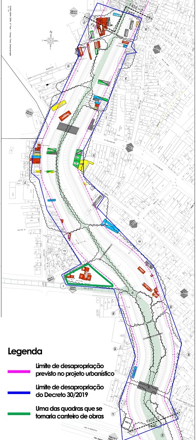 O novo projeto englobou intervenções em uma extensão de 2.200 metros, ao longo dos quais centenas de famílias tiveram de ser deslocadas. Em 2013, foi prevista a retirada de cerca de 930 famílias (SILVA, 2016). Todas receberiam auxílio moradia de R$ 300 enquanto os residenciais previstos para o remanejamento não fossem concluídos. Em 2019, no entanto, o número de famílias deslocadas já chegava a 1.511. Esse aumento considerável se associou, em parte, ao Decreto nº 30/2019, promulgado pelo Governo do Estado do Pará, por meio do qual foram definidas as áreas de utilidade pública para fins de desapropriação na Bacia do Tucunduba. Porém, a faixa de desapropriação incluída no decreto foi maior que a faixa prevista anteriormente no projeto urbanístico, passando a englobar a desapropriação de duas quadras inteiras (Figura 4), que, de início, serviriam como canteiro de obras e, posteriormente, seriam transformadas em praças. Ou seja, as famílias seriam removidas desses espaços por motivos puramente funcionalistas, que em nada se relacionam com a melhoria das condições ambientais na Bacia do Tucunduba.