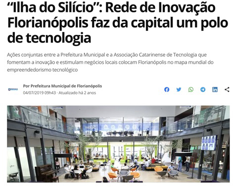 FLORIANÓPOLIS. “Ilha do Silício”: Rede de Inovação Florianópolis faz da capital um polo de tecnologia. G1, Especial Publicitário, 4 jul. 2019. Disponível em: Disponível em: https://curtlink.com/6k8XV84. Acesso em: 14 abr. 2022.
