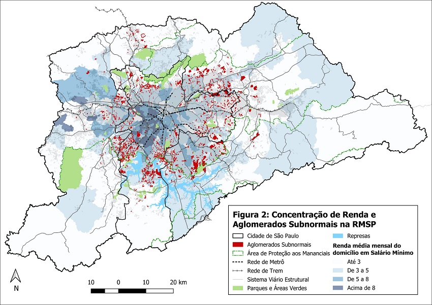 No entanto, apesar dessa grande concentração de riqueza, a distribuição de renda na metrópole é extremamente desigual. Em 2015, 42% dos domicílios situavam-se abaixo da faixa de renda mensal de três salários mínimos (SM) (R$ 2.364), dependendo de subsídios públicos para ter acesso à moradia, e apenas 4% estavam localizados acima da faixa dos vinte SM (R$ 15.760) (IBGE, 2023a). Contudo, esses números são melhores do que os da média nacional, uma vez que 58% dos domicílios brasileiros se encontravam na faixa de rendimento menor que três SM e somente 2% estavam na faixa de mais de vinte (ibid.).