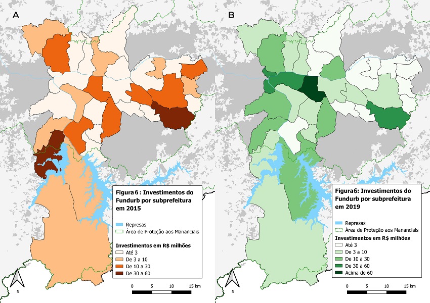 Considerando a concentração territorial dos investimentos, é possível perceber que eles variam de acordo com a administração municipal vigente. As administrações de esquerda tendem a investir mais nas franjas periféricas, enquanto as neoliberais tendem a investir mais nas centrais, como pode ser visto nos mapas de localização dos recursos para os anos de 2015 e 2019, presentes na Figura 6 (CIDADE DE SÃO PAULO, 2015; 2019).