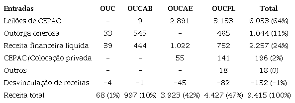 De acordo com essa tabela, é possível verificar que a OUCFL e a OUCAE tiveram maior sucesso do ponto de vista financeiro, pois foram responsáveis por 89% das receitas e por 99% dos leilões do CEPAC. A pequena participação da OUCAB decorre, em parte, do fato de ela ter sido revisada muito recentemente (2013); apesar de poder emitir CEPAC, foi reduzido o interesse do setor imobiliário em seu primeiro leilão, visto que houve aquisição de apenas 10% dos certificados ofertados. Já a Operação Urbana Centro não foi revisada e não pode emiti-los.