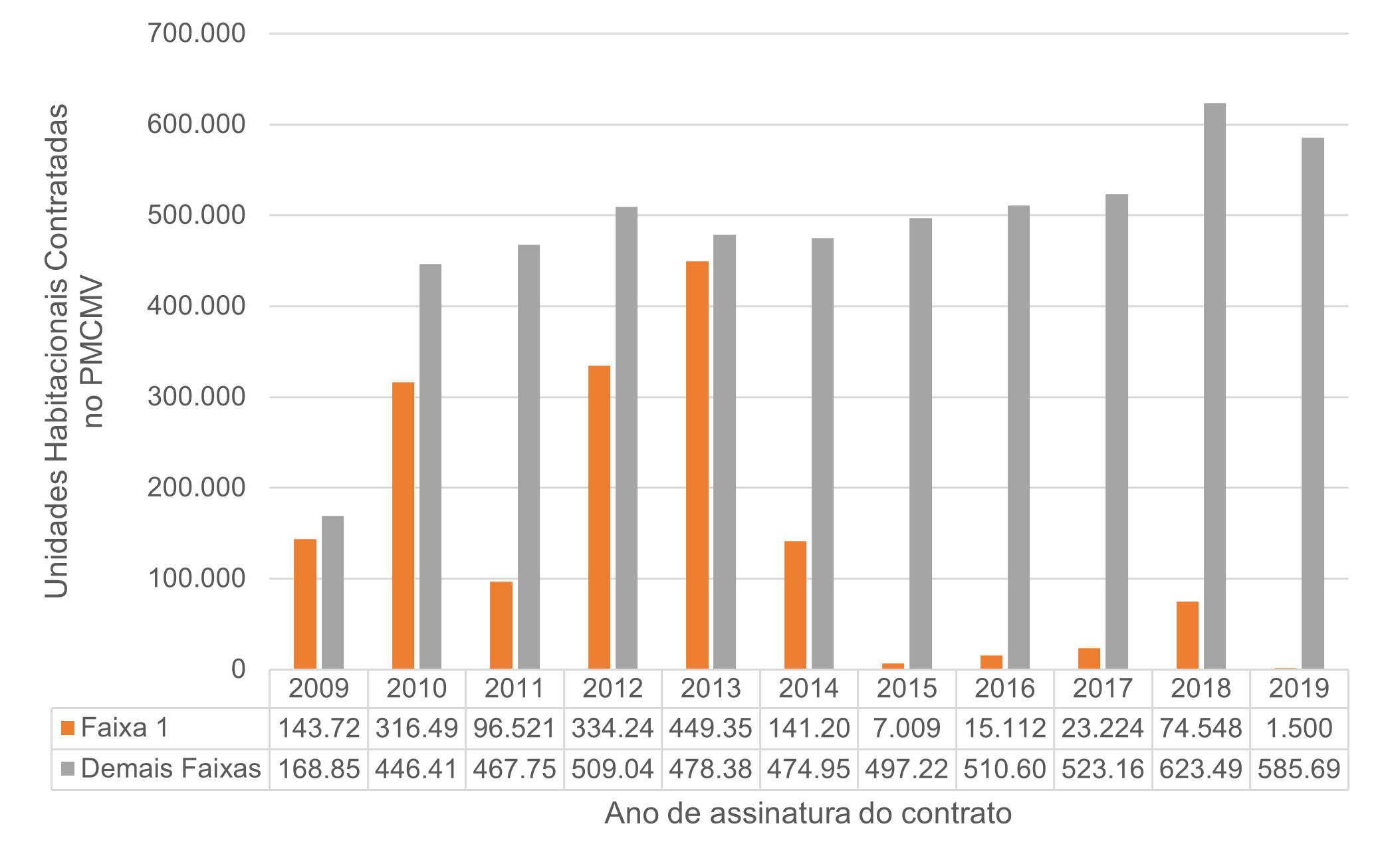 Nota-se, ainda, que, nos últimos quatro anos da série, há valores expressivos de contratações para as Demais Faixas, sinalizando o pleno funcionamento de um complexo imobiliário-financeiro desencadeado pelo PMCMV (SHIMBO, 2016; SHIMBO; BARAVELLI, 2022), reforçado sobretudo pelo contexto de baixas históricas das taxas de juros.