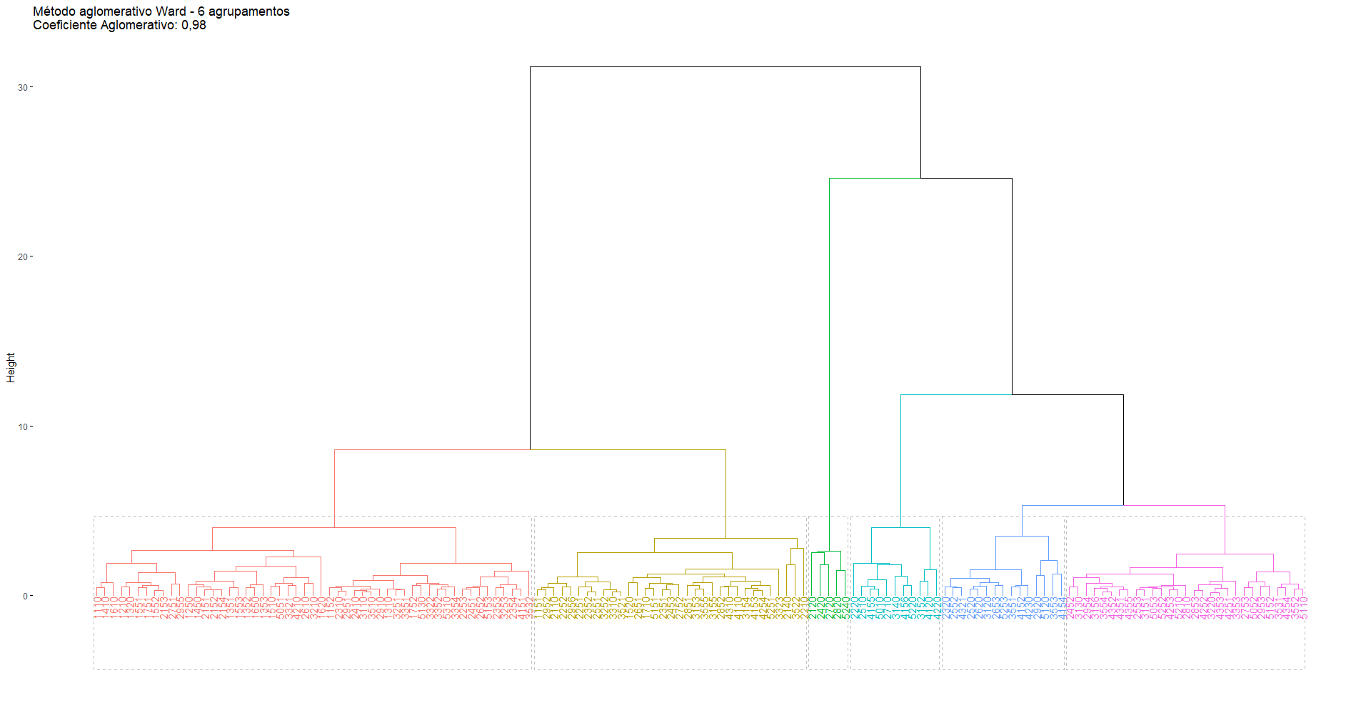 O método cluster selecionado para agrupar os estrados do IBGE foi o Ward. Trata-se de um método de clusterização hierárquico que, partindo de uma matriz de distância euclidiana construída com as variáveis, consiste na minimização da soma dos erros quadráticos, isto é, da variância intra-agrupamento em cada estágio de agregação dos diferentes elementos/observações segundo as distâncias entre as variáveis (EVERITT et al., 2011; DONI, 2004). Em outras palavras, as observações (os estratos geográficos), posteriormente grupos, se unem somente àquelas observações (estratos geográficos) que incrementam menos a soma dos erros quadráticos, ou a variância, do grupo com a adição de um novo elemento; portanto, unem-se, em cada etapa, apenas elementos/observações/grupos com menor dissimilaridade entre si e maior diferença em relação aos outros grupos (KAUFMAN; ROUSSEEUW, 1990).