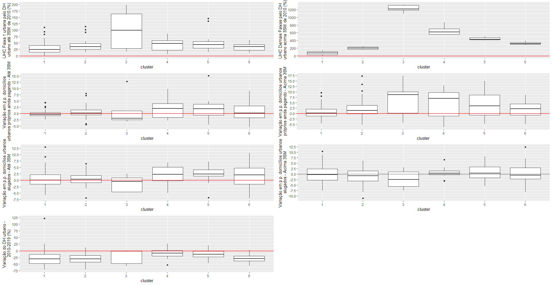Os agrupamentos de 3 a 6 apresentam, no geral, maior intensidade de UHC no período, principalmente das habitações sociais de mercado. Além do grau de intensidade de contratos, outras variações, em especial da situação de ocupação do domicílio, fizeram com que os estratos se agrupassem de maneira distinta.