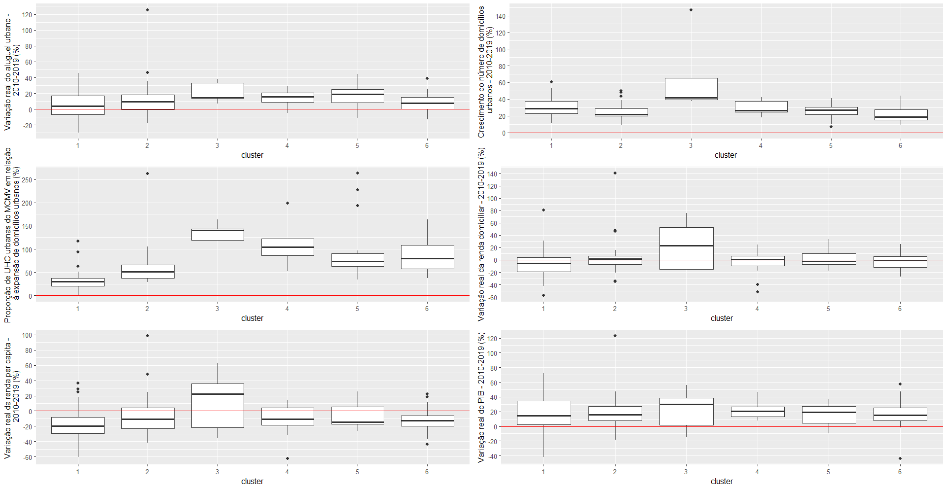 Por fim, o Cluster 6, composto de 29 estratos, situa-se em quarto lugar na intensidade de contratos de habitação social de mercado (Gráfico 2). Esse grupo difere dos três anteriores porque exibe menor variação positiva do crescimento de domicílios urbanos, ao lado de maior número de estratos com variações reais negativas da renda domiciliar e da renda domiciliar per capita (Gráfico 3). Portanto, é um agrupamento de ligação intermediário entre o Cluster 2 e os Clusters 3, 4 e 5.