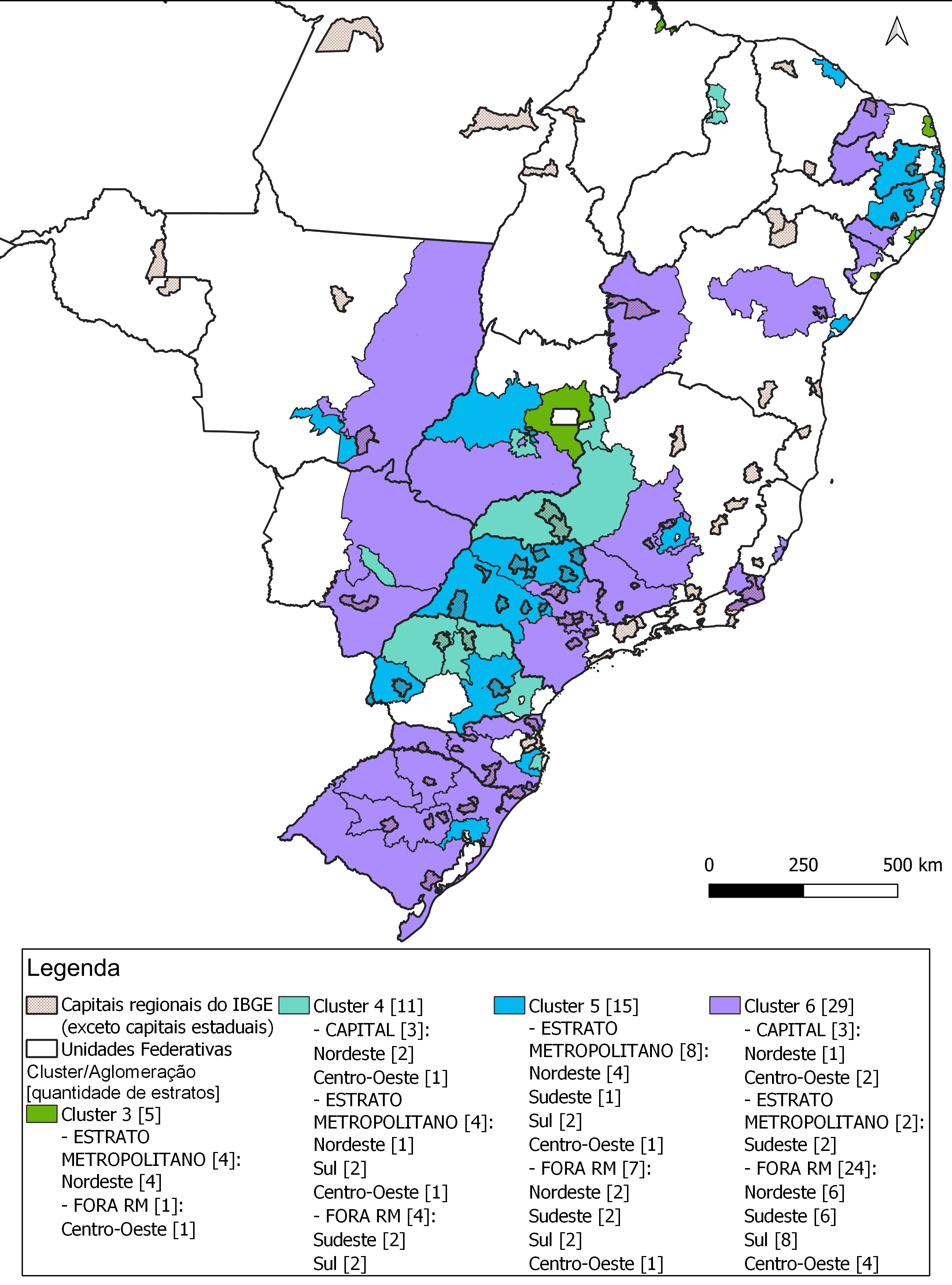 Já os resultados de agrupamento (clusterização) - fundamentalmente nos Clusters 3, 4 e 5 - apontam para a territorialização (aclimatação) privilegiada em estratos com capitais regionais (não capitais estaduais) e em estratos metropolitanos. O primeiro caso, com notável contiguidade espacial, envolve o interior de Goiás, Minas Gerais, São Paulo e Paraná. No segundo, tem-se a tipologia espacial de regiões metropolitanas do Centro-Oeste, do Sul e do Nordeste.