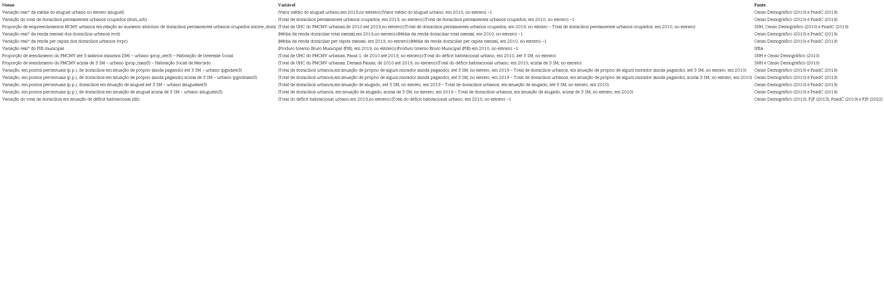 Deste modo, além da base de dados da PnadC de 2019, utilizamos o Censo Demográfico de 2010 (IBGE, 2012), agregando os municípios e as variáveis de interesse pelos respectivos estratos geográficos; os registros de empreendimentos contratados, disponibilizados publicamente pela Secretaria Nacional de Habitação (SNH); os dados do déficit habitacional produzidos pela Fundação João Pinheiro (FJP); e os dados do Instituto de Pesquisa Aplicada (IPEA) para o Produto Interno Bruto Municipal (PIB). As variáveis utilizadas estão indicadas no Quadro 1. Ressalta-se que privilegiamos a análise em termos de variação ou em pontos percentuais, pois o objetivo era minimizar as discrepâncias trazidas pela utilização dos números absolutos.