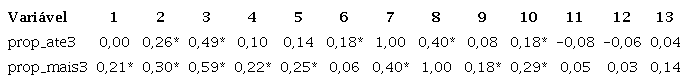 A proporção de habitações de interesse social (prop_ate3) apresenta correlação significativa com um conjunto menor de variáveis e, geralmente, é uma correlação mais fraca. Por exemplo, foi positiva com a expansão de domicílios urbanos (dom_urb), com a variação real do PIB municipal (vpib), com a proporção de atendimento nas faixas superiores do PMCMV (prop_mais3) e com o aumento em pontos percentuais da ocupação em domicílios próprios (ainda pagando), acima de três salários mínimos (pgndm3).
