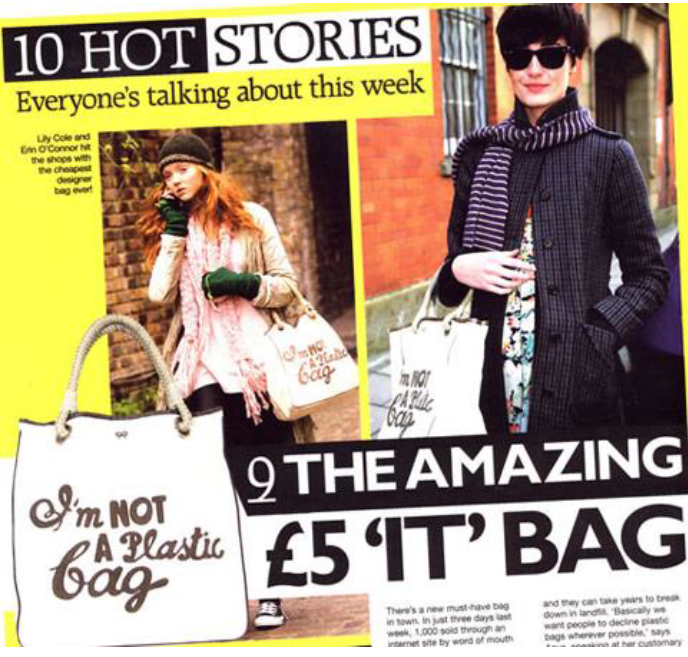 A bolsa com proposta ecológica virou produto “fashion”, exibido por celebridades da cultura pop, o que fez surgir várias outras bolsas inspiradas na mesma fórmula (bolsas para substituírem sacolas plásticas). No site que a imagem foi retirada, o texto da reportagem menciona que o uso por pessoas famosas, além de promover a divulgação da peça, ainda fez com que ganhe o produto ganhasse em valor financeiro: “De qualquer forma, com o endosso de celebridades, o resultado é que os sacos estavam custando £ 200 no eBay”. Apesar do furor envolvido quando da disponibilização da bolsa no mercado, a estilista Hindmarch foi acusada de não atender os princípios sustentáveis, pois a mesma era fabricada na China, país conhecido por exploração de mão de obra e por uso de materiais não orgânicos.
