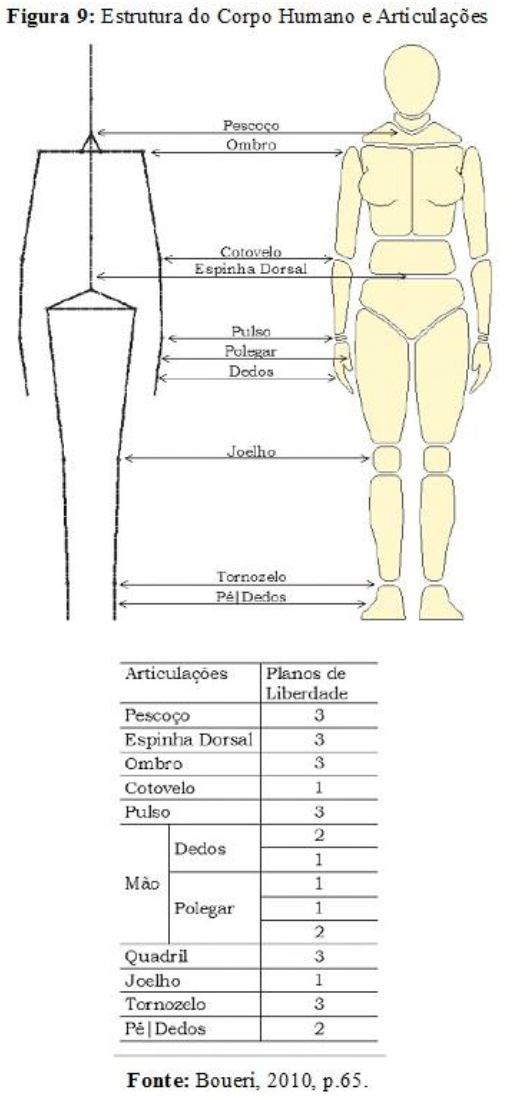 Na Figura 4, observam-se as seguintes possibilidades: do braço proporcionado pela articulação do ombro até o cotovelo e do ombro até o pulso; do pulso quanto a mão; o levantamento do ombro com referência o peito, o pescoço, cintura para o tronco, enfim, considera todas as articulações, suas possibilidades e limitações de movimento.