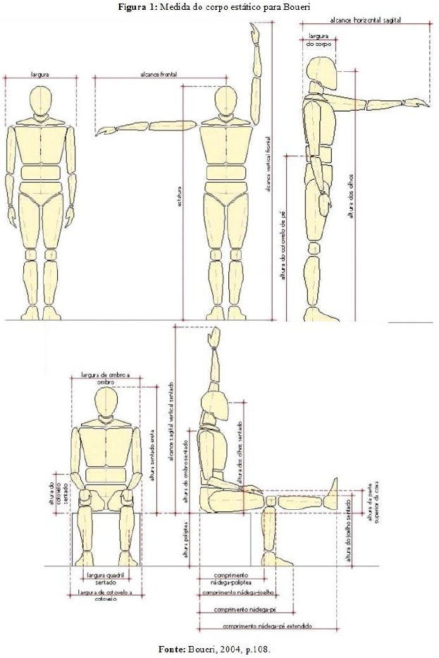 Quanto ao corpo sentado (Figura 1), Boueri abrange na mensuração da antropometria estática as dimensões: largura de ombro a ombro, altura sentado ereta, altura do cotovelo sentado, largura do quadril sentado, largura de cotovelo à cotovelo, alcance sagital vertical sentado (sentado e com o braço esticado para cima mede-se da base do quadril até as pontas dos dedos), altura do ombro sentado, altura dos olhos sentado, altura poliptea (parte inferior da coxa), altura do joelho sentado, altura da parte superior da coxa, comprimento nádega-poliptea, comprimento nádega-joelho, comprimento nádega-pé, e por fim comprimento nádega-pé extendido (BOUERI, 2008).