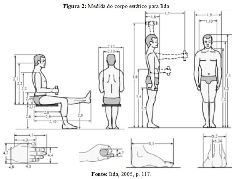 Já de acordo com Iida, as dimensões no corpo sentado são (Figura 2): altura da cabeça a partir do assento com o tronco ereto, altura dos olhos a partir do assento com o tronco ereto, altura dos ombros a partir do assento com o tronco ereto, altura do cotovelo a partir do assento com o tronco ereto, altura do joelho sentado, altura poplítea, comprimento do antebraço na horizontal até o centro da mão, comprimento nádega- poliptea, comprimento nádega-joelho, comprimento nádega-pé com a perna extendida na horizontal, altura da parte superior das coxas, largura entre os cotovelos, largura do quadril sentado (IIDA, 2005).