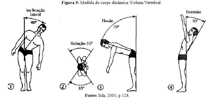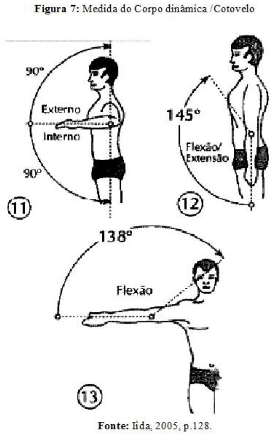 As Figuras 5, 6, 7 e 8 demonstram o mesmo conceito mas sob a ótica de Iida, sendo que este autor subdivide as medições em: movimentos da coluna vertebral, do ombro, do cotovelo e do quadril e joelhos.