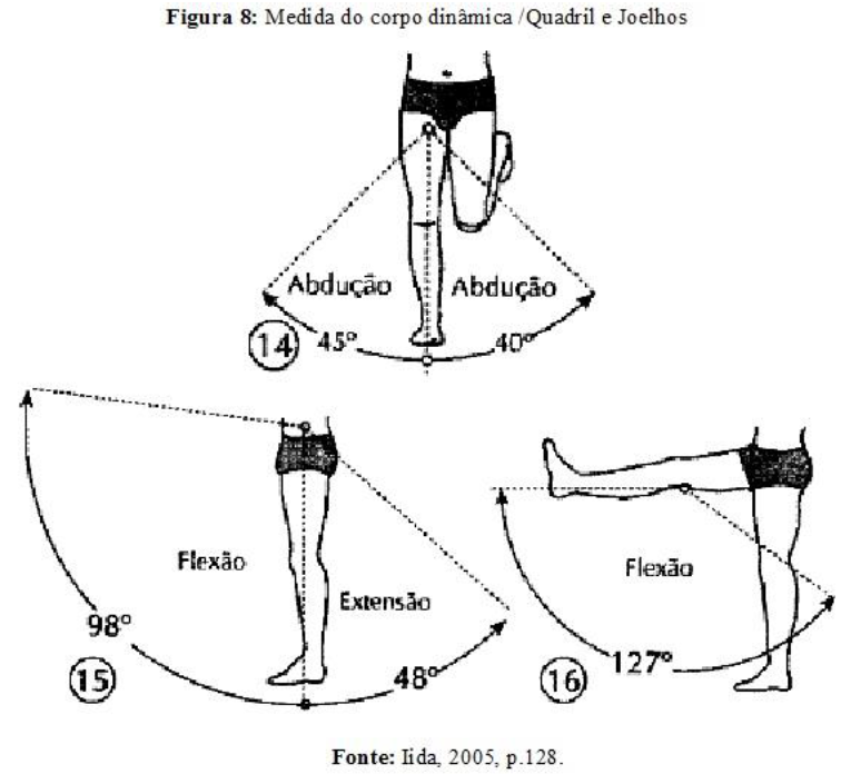 Nas variáveis da antropometria dinâmica apresentada na Figura 8, estão as possibilidades de rotação e ação do quadril e do joelho, sendo a perna outro elemento a ser considerado e observado atentamente pelos profissionais do vestuário a fim de aperfeiçoar seus produtos.