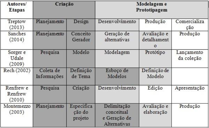 Para esclarecer o processo de desenvolvimento de produto do vestuário, elaborou-se uma tabela com bases nos autores: Treptow (2013), Sanches (2014), Sorger e Udale (2009), Rech (2002), Renfrew e Renfrew (2010) e Montemezzo (2003). Após análise, é possível perceber que a primeira etapa em todos os processos se inicia com o planejamento, pesquisa ou coleta de informações. Na Tabela 01, seguem explicações gerais sobre as etapas dos processos de desenvolvimento de produto do vestuário.