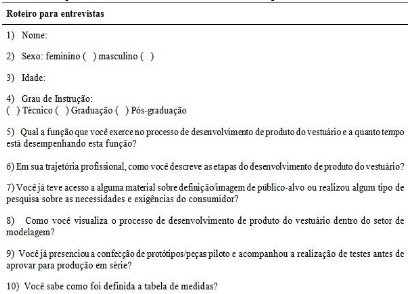Este artigo se caracteriza como uma pesquisa qualitativa, e quanto à natureza do seu objetivo é uma pesquisa exploratória. Entre os procedimentos metodológicos empregados foi realizada uma pesquisa bibliográfica em livros, teses e dissertações, a respeito das etapas de desenvolvimento de produto de vestuário. Também foram realizadas entrevistas semiestruturadas com 15 profissionais da área, os quais estão atuando como estilistas, modelistas ou auxiliares. O Quadro 01 apresenta o roteiro da entrevista composto pela identificação pessoal, formação acadêmica, atuação profissional e perguntas.