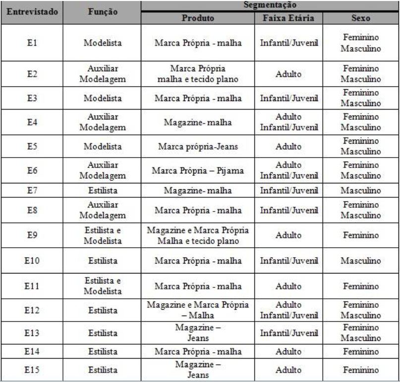 A pesquisa contou com a participação de 15 profissionais da área de desenvolvimento de produto de vestuário, sendo 6 estilistas, 3 modelistas, 2 com funções acumuladas de estilista e modelista, 4 auxiliares de modelagem. A amostra teve 11 mulheres e 4 homens com idade entre 21 e 51 anos. O tempo de atuação na área varia de 5 meses a 14 anos. A respeito do grau de instrução dos entrevistados, 5 possuem curso técnico em modelagem do vestuário, 4 graduação em design de moda e 2 estão cursando, 4 possuem pós-graduação.