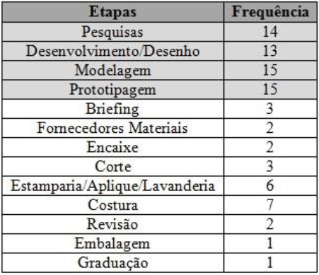 Os entrevistados relataram por quais etapas passa o desenvolvimento de produto do vestuário e entre as mais lembradas destaca-se a pesquisa de moda, o desenvolvimento/desenho do setor de estilo, a modelagem e a prototipagem conforme Tabela 03.