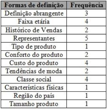 Ao serem questionados sobre a definição do perfil do público-alvo para o qual desenvolve os produtos de vestuário, os entrevistados responderam de acordo com diferentes critérios. Conforme Tabela 04 abaixo, 4 entrevistados definiram seu público de acordo com faixa-etária, 2 afirmaram que essa informação vem da análise do histórico de vendas, 6 através da troca de informações com os representantes, 1 pelo estilo do produto, 2 de acordo com o conforto do produto, 4 definiram seu público através do custo final do produto, 2 através do uso de informações das tendências de moda, 4 pela classe social e 1 pelas características físicas do consumidor. Os entrevistados E2, E9 e E14 apresentam uma definição abrangente em relação ao público-alvo: “... é uma coisa meio assim: de 8 a 80, faz para todo mundo...”; “... a gente faz um pouco de cada coisa na coleção, um pouco mais senhora, outro pouco mais moderninho...”; “... queria atingir vários públicos, de uma faixa etária de 18 a 50 anos...”.