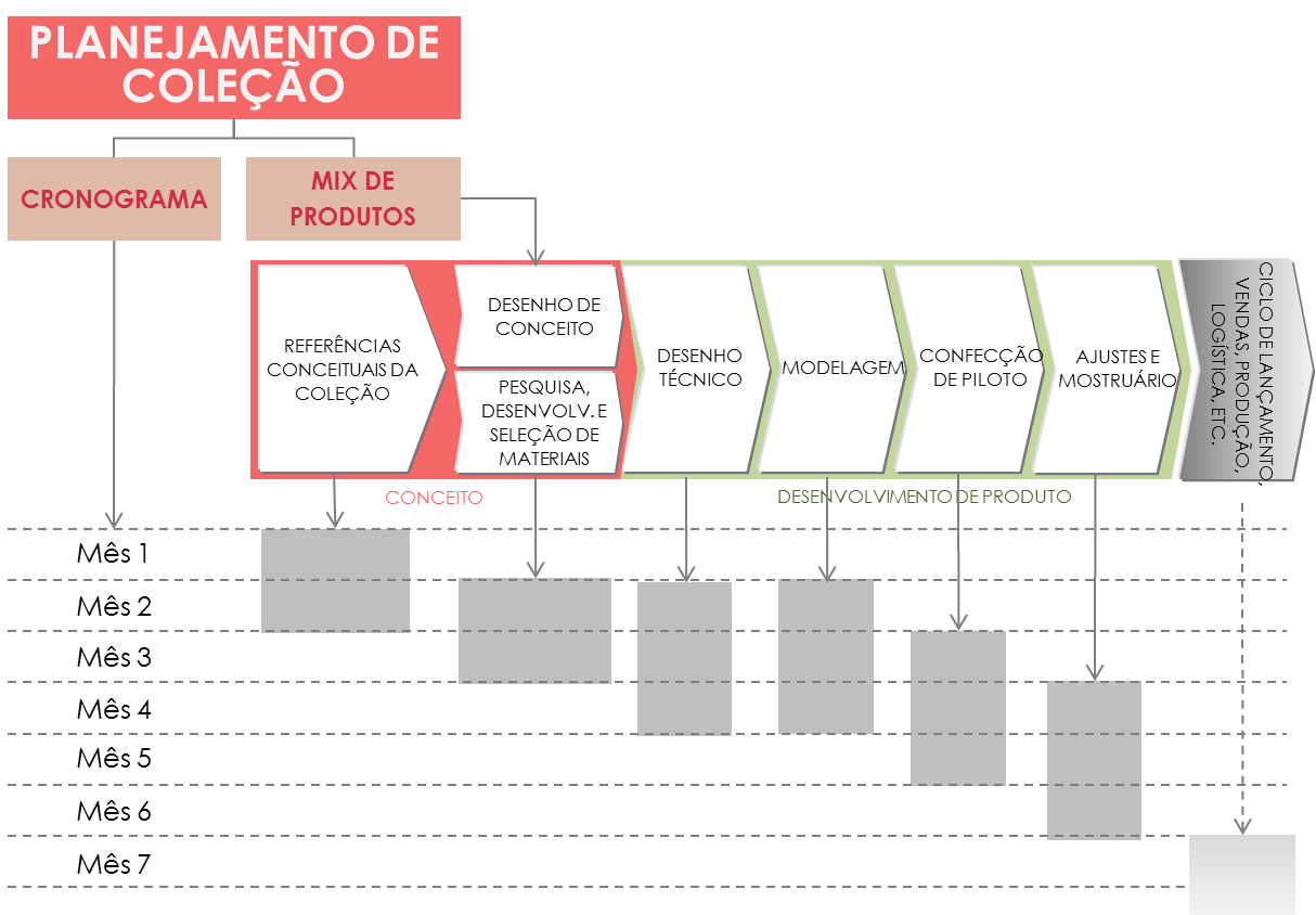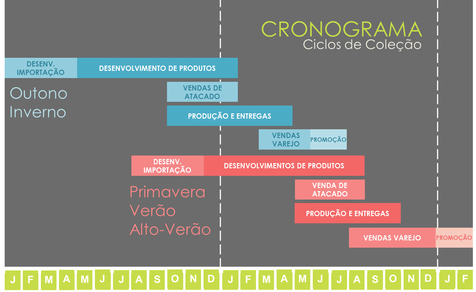 Por este motivo, os Administradores de Marcas mantêm um padrão de mercado no que tange aos ciclos gerais de venda e promoções de varejo, que conduzem a um ciclo de abastecimento das marcas por produtos provenientes das confecções. Da mesma forma, para que os produtos sejam confeccionados ou importados, estes precisam ser anteriormente desenvolvidos, o que resulta em um cronograma que é seguido por todo o mercado (figura 8).
