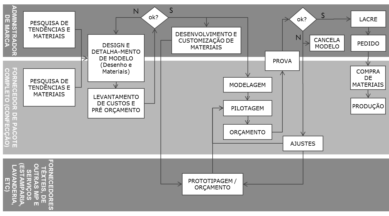 O processo de desenvolvimento de produtos mapeado nos casos estudados permeia, principalmente, os elos da marca, da confecção fornecedora de pacote completo e de fornecedores têxteis, de outros materiais e de serviços especializados (figura 9).