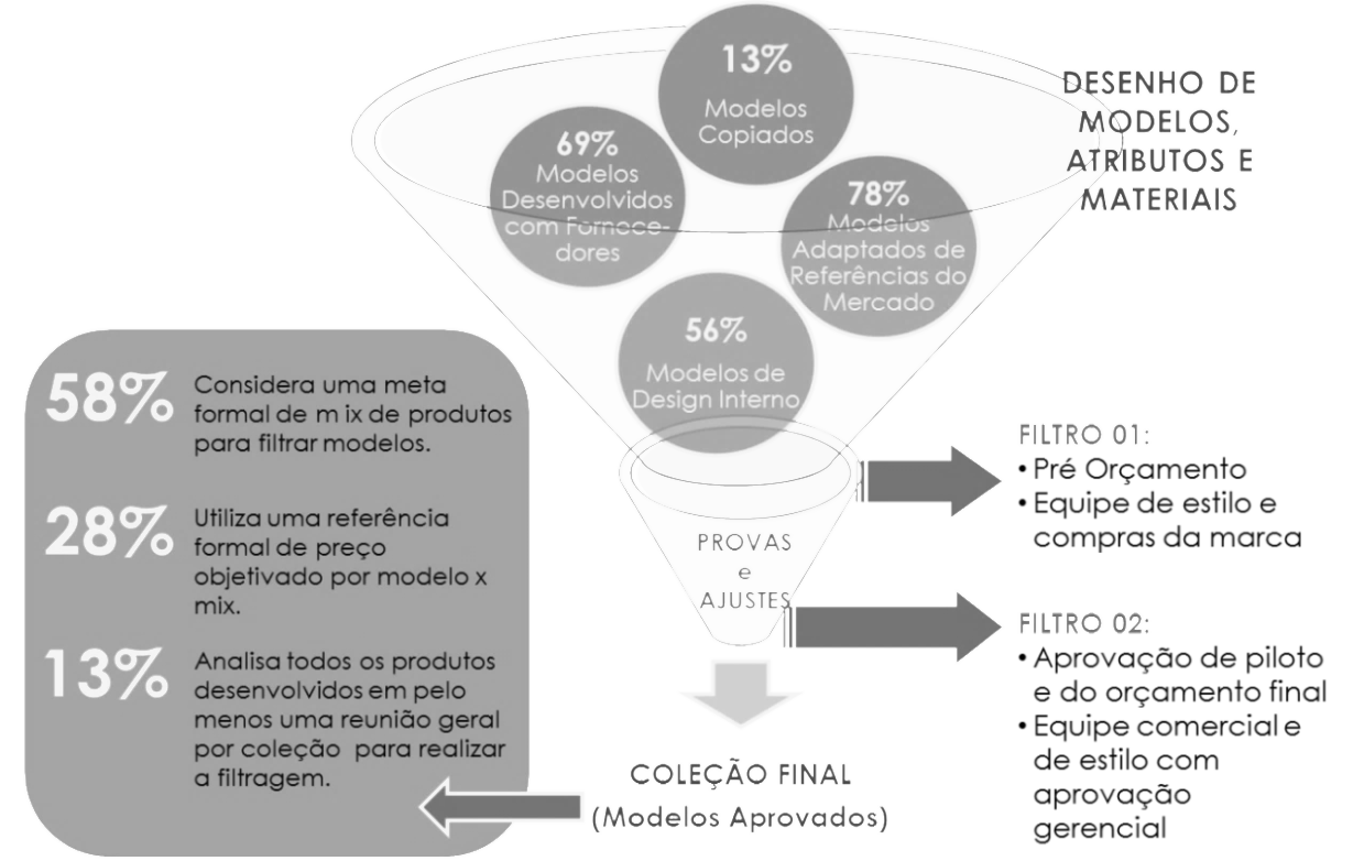 A entrada do funil é a geração de ideias de modelos, o primeiro filtro seleciona ideias conforme a coerência do modelo com a linguagem da marca e o conceito da coleção, a segunda etapa é a de detalhamento das ideias em fichas técnicas, a prototipagem e a realização de provas e ajustes. O segundo filtro é a análise, tanto do ponto de vista do produto (modelagem, estética, vestibilidade, qualidade), quanto da margem (custo versus preço objetivado pela marca). Os produtos aprovados por este segundo filtro são lançados ao consumidor final.