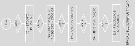 No modelo de Stage-Gates de Cooper (1990) o autor organiza este processo em etapas e pontos de decisão chamados gates, nos quais são avaliados projetos em um contexto de portfólio de acordo com critérios pré-definidos. O autor destaca que este processo envolve geralmente de quatro a sete estágios, entre os quais existem filtros que definem quais itens provenientes das etapas anteriores prosseguirão, quais serão eliminados, quais ficarão em espera e quais deverão ser revisados antes de ir ao próximo passo (figura 1).