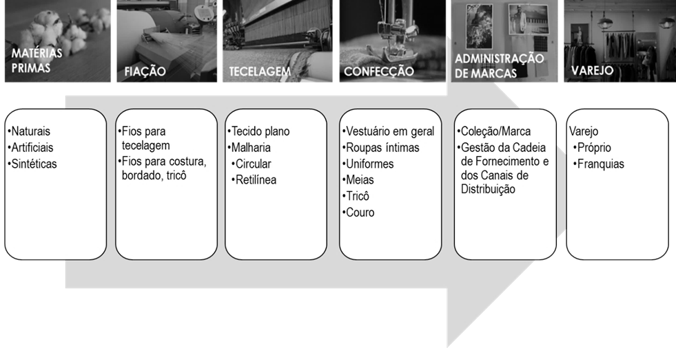 A cadeia têxtil-vestuário se inicia na produção de matérias-primas (agropecuária para fibras naturais, indústria química e petroquímica para fibras artificiais e sintéticas), fiação e tecelagem. Em seguida, se inicia a parte da cadeia efetivamente composta pelas indústrias de vestuário – confecções, administradores de marca e varejo.