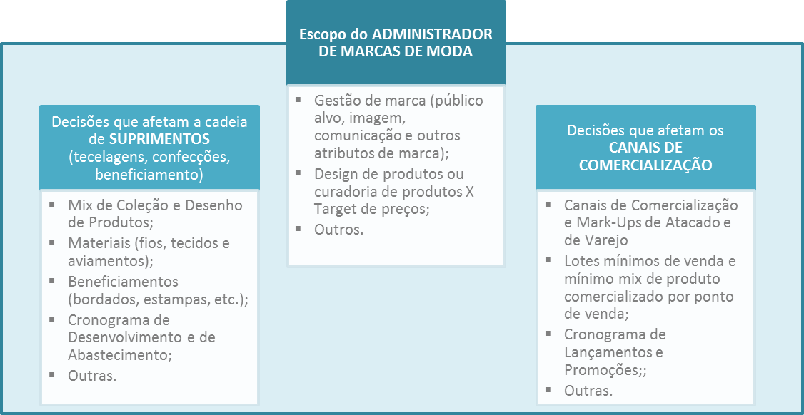 A escolha de concentrar canal de distribuição ao consumidor em sua estrutura ou delega-lo a terceiros impacta em diferentes estruturas de investimento, risco e retorno, que fazem parte da estratégia individual de cada marca. Porém, mesmo quando não concentram o canal de vendas ao consumidor, os Administradores de Marcas ainda detêm a governança da cadeia, pois definem suas principais regras de funcionamento, como ciclos de lançamento, mix de produtos, preços e margens, entre outras (figura 4).
