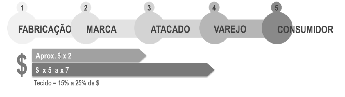 Em termos de preço e mark-ups, por exemplo, a confecção relatou que as suas marcas clientes utilizam um multiplicador de aproximadamente duas vezes o preço da confecção para definir o preço de venda a atacado, e de cinco a sete vezes o preço da confecção para definir o preço de varejo (figura 5).